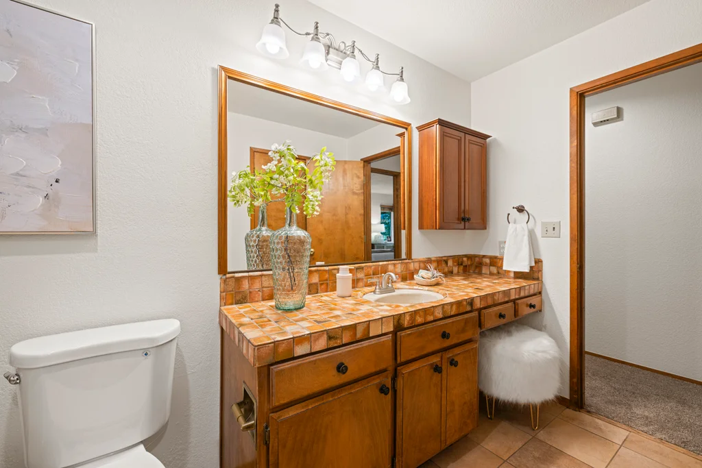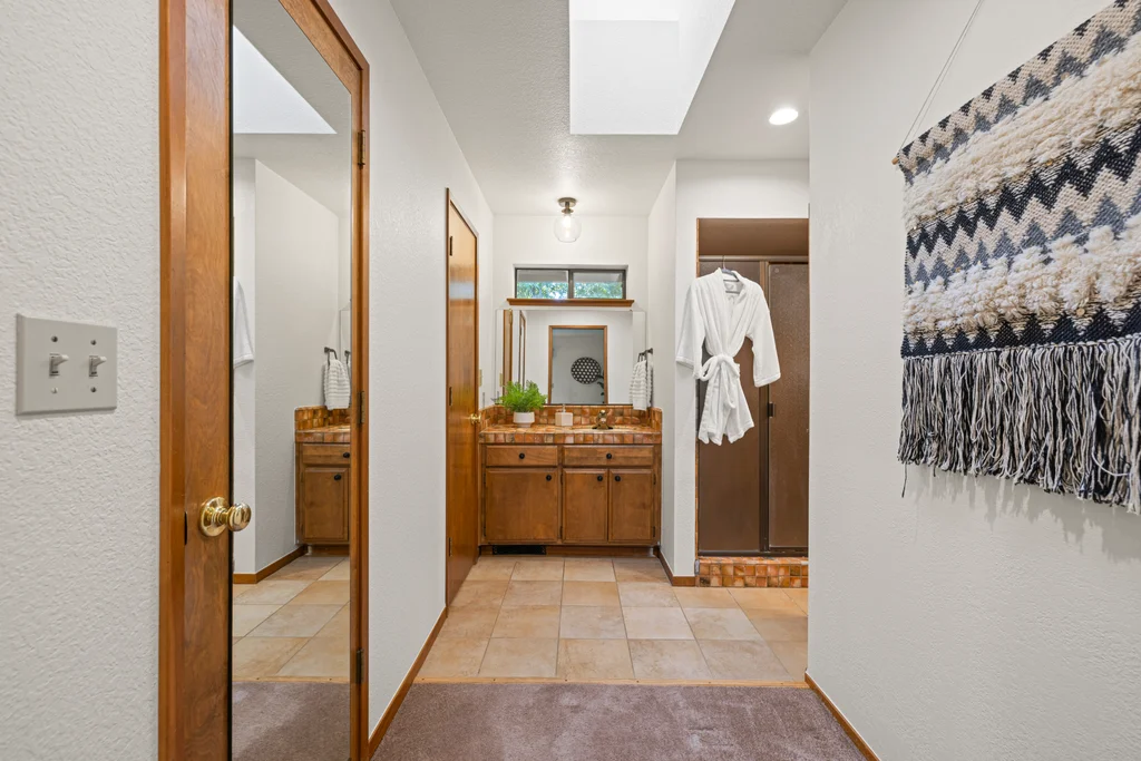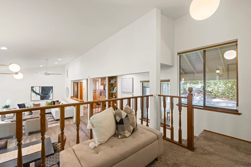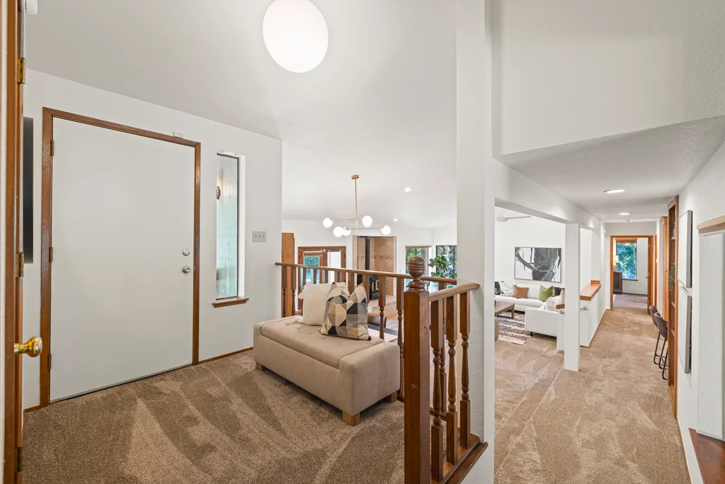 The primary suite sits on its own private wing of the main level, and offers two walk-in closets, a split en-suite bathroom, and direct access to the front deck. The other bedroom wing, at the top of the stairs, features three bedrooms and a full bathroom, centered around a family/playroom.