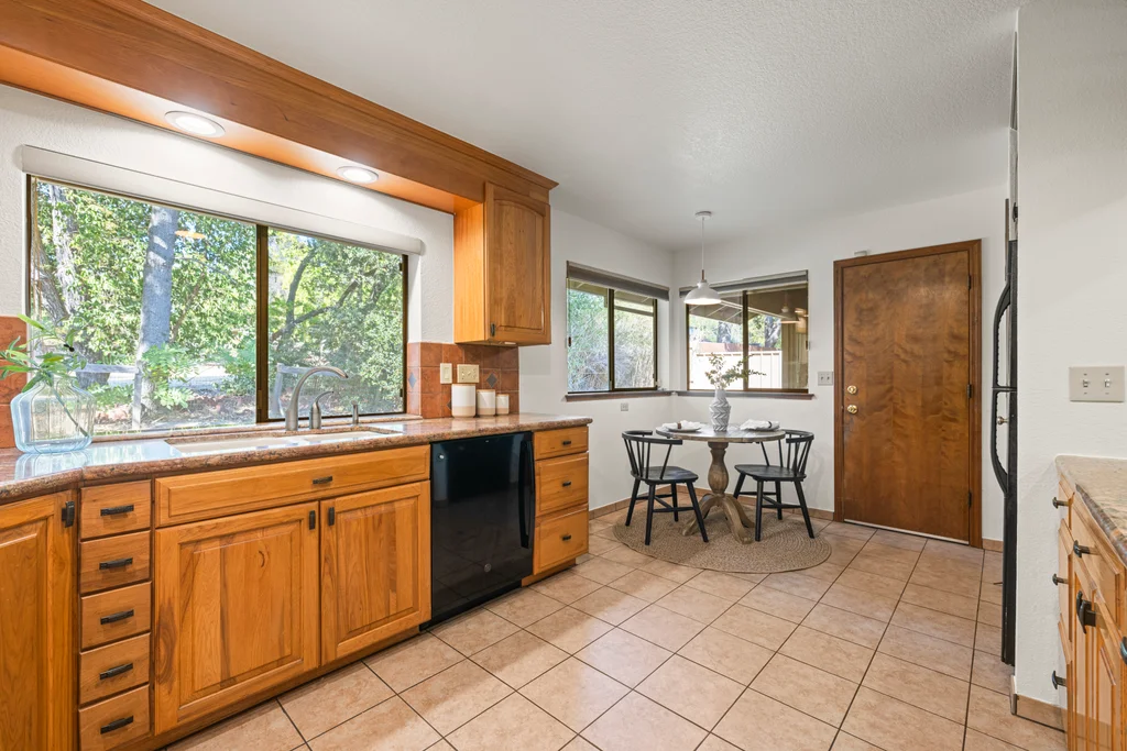 The split-level layout features a great room with soaring ceilings, a dining area, and a wood-burning fireplace. The adjacent kitchen has granite counters, ample storage, and a breakfast nook with access to the back porch for easy indoor-outdoor living.
